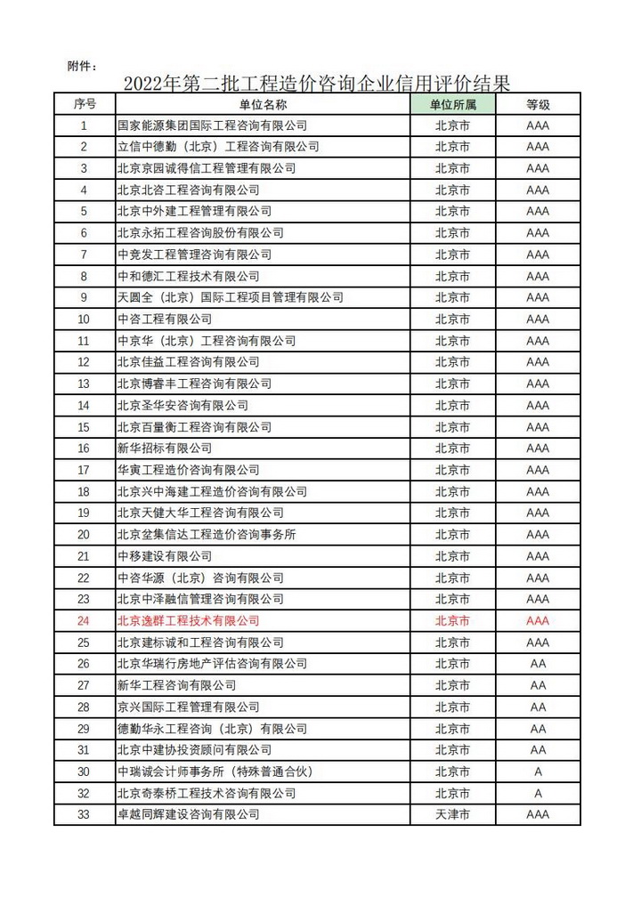 2022年10月28日,中國建設(shè)工程造價管理協(xié)會發(fā)布《關(guān)于2022年第二批工程造價咨詢企業(yè)信用評價結(jié)果的公示》,北京逸群工程技術(shù)有限公司名列25個AAA級工程造價咨詢企業(yè)行列,也是公司連續(xù)四年冠以“AAA級工程造價咨詢企業(yè)”稱號!