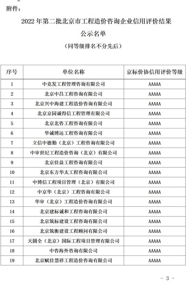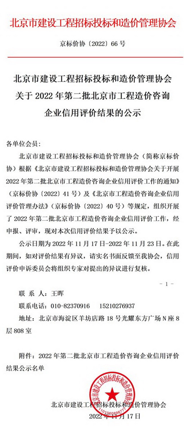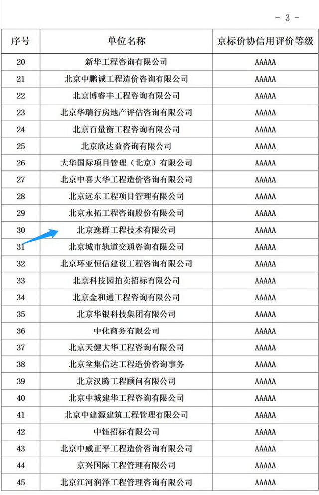 2022年11月17日,北京市建設(shè)工程招標(biāo)投標(biāo)和造價(jià)管理協(xié)會(huì)發(fā)布了“關(guān)于2022年第二批度北京市工程造價(jià)咨詢企業(yè)信用評價(jià)結(jié)果的公示”,北京逸群工程技術(shù)有限公司榮獲北京市工程造價(jià)咨詢企業(yè)信用評價(jià)最高等級-“AAAAA”級。