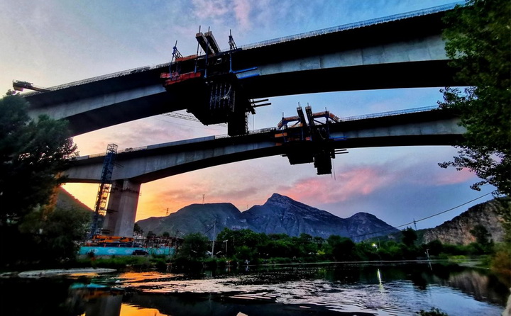 陳家莊特大橋上跨永定河、石擔(dān)路、109國(guó)道,最終與谷山村隧道相連,全長(zhǎng)776米,是國(guó)道109新線高速三座跨永定河大橋之中的第二座。大橋主橋段跨徑總長(zhǎng)496米,主跨長(zhǎng)度153米,由于鄰近永定河,環(huán)保要求高,同時(shí),其結(jié)構(gòu)復(fù)雜,是全線的節(jié)點(diǎn)控制性工程。陳家莊特大橋?qū)儆谒目邕B續(xù)剛構(gòu)橋梁,是北京目前第一大跨連續(xù)剛構(gòu)橋梁。其中,陳家莊特大橋連續(xù)梁中跨位于永定河正上方,采用掛籃懸臂澆筑法施工,依靠“掛籃”的移動(dòng)讓橋梁在空中延伸,此次合龍順序?yàn)橄冗吙绾笾锌?,最終實(shí)現(xiàn)順利合龍。