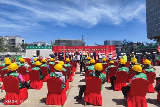 公司總經(jīng)理張明代表監(jiān)理單位致辭。封頂儀式現(xiàn)場(chǎng)橫幅掛立,一派喜慶,建設(shè)、監(jiān)理、施工單位等各方領(lǐng)導(dǎo)到場(chǎng)。
